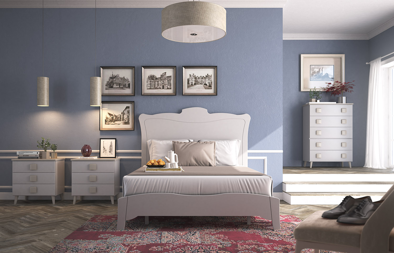 Dormitorio en MDF lacado en marfil y piedra.