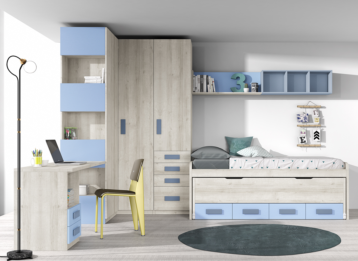 Composicion 318 en acabado Roble, Bruma, Celeste