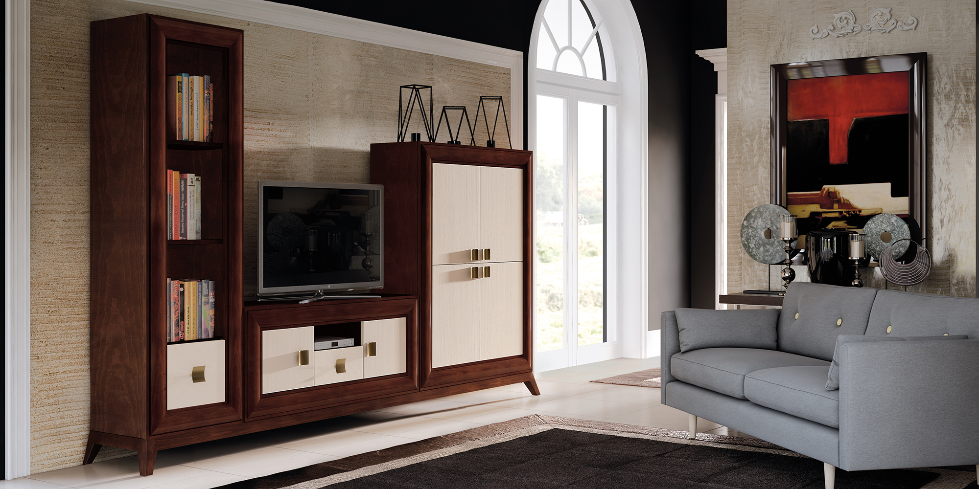 Composicion Alma 12 de 3,20metros en madera de pino barnizado avellana combinado con frentes lacados vison