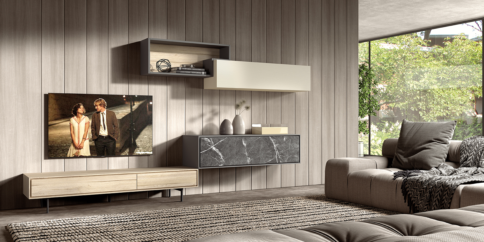 Composicion Iris 34 de 298cm en Roble Canada – Grafito Poro – Arena Poro – Marmol Gris