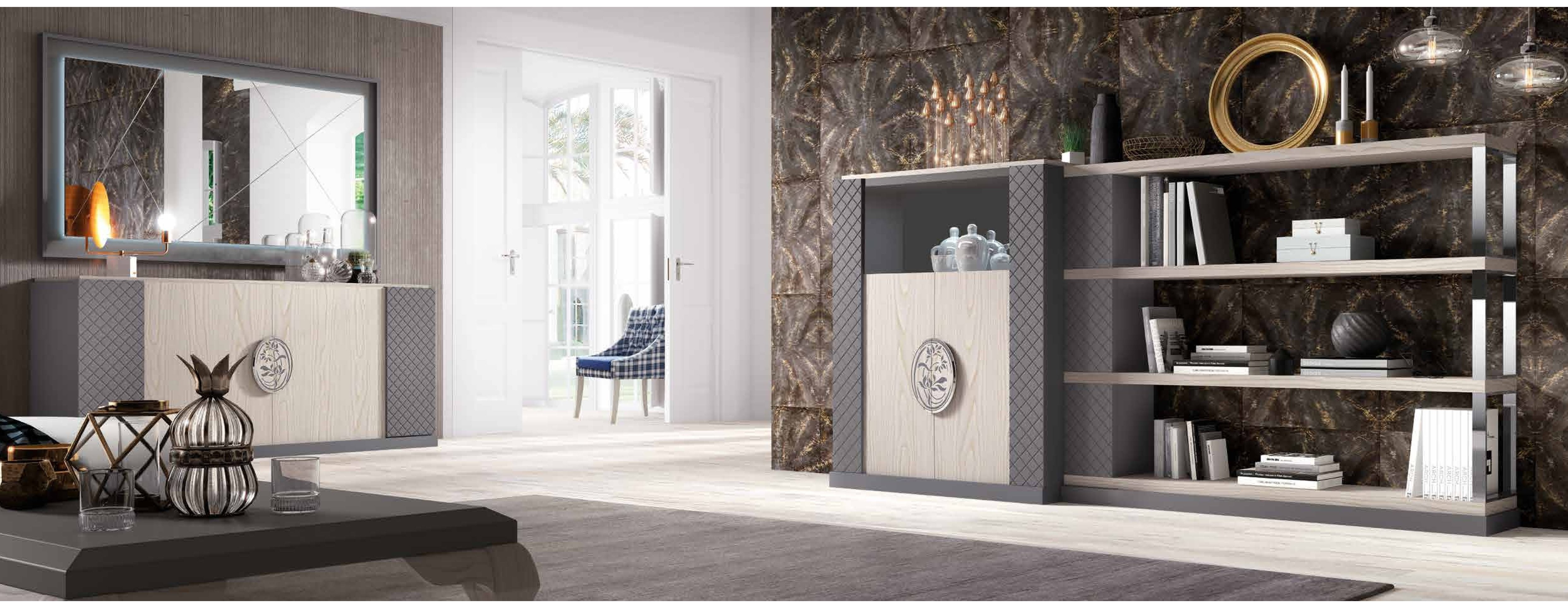 Composicion Lagon 01 lacado gris con frentes chapa fresno color natural.
