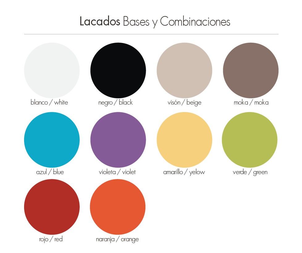 | Color | Ceniza, Cerezo, Lacado amarillo, Lacado azul, Lacado blanco, Lacado moka, Lacado naranja, Lacado negro, Lacado rojo, Lacado verde, Lacado violeta, Lacado vison, Miel, Natural, Nogal, Roble, Wengue |